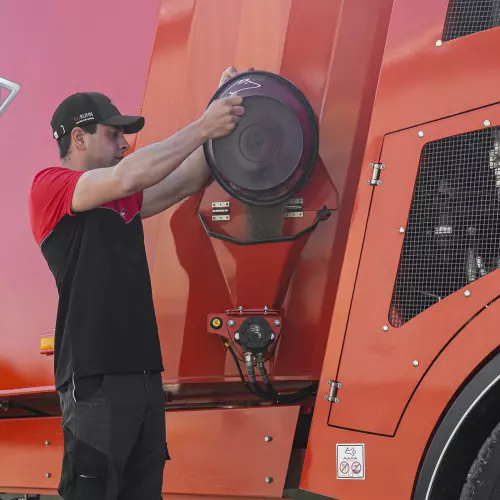 Il convogliatore, ancorato alla parte superiore del serbatoio, facilita il caricamento dei foraggi nel serbatoio pieno. I foraggi escono dal convogliatore nella parte superiore del serbatoio, permettendo di caricare completamente il serbatoio di miscelazione.
