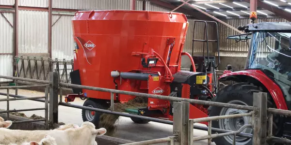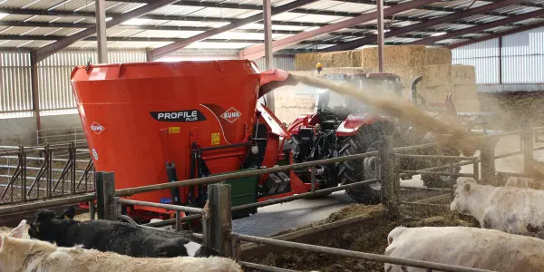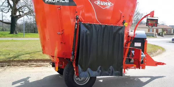 Carro miscelatore a vasca larga PROFILE 1 DL a 1 coclea verticale con distribuzione laterale. Disponibile con capacità da 9 a 17 m3 per allevamenti da 45 a 110 capi.