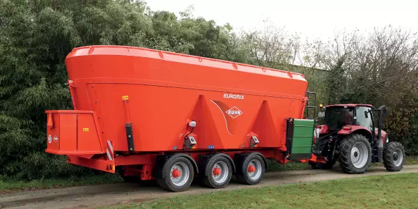 Carro miscelatore a vasca larga EUROMIX a 3 coclee verticali con tappeto di distribuzione trasversale. Disponibile con capacità da 28 a 45 m³, per mandrie da latte comprese tra 140 e 360 capi di bestiame.