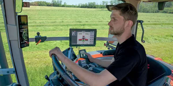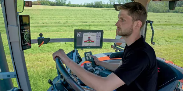 Per una maggiore manovrabilità, KUHN offre anche l'aggiunta di un joystick ISOBUS, il CCI A3 al terminale, che mostra tutte le funzioni su un touchscreen, in modo da poterle visualizzare e attivare direttamente.