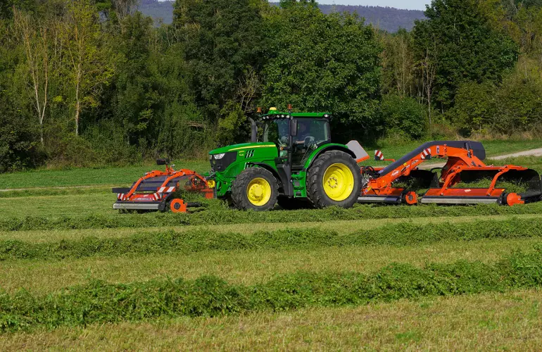 L'attacco frontale impedisce al foraggio di essere schiacciato dalle ruote del trattore.