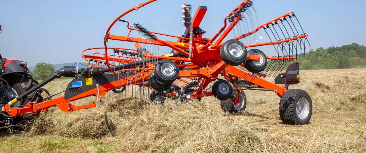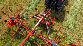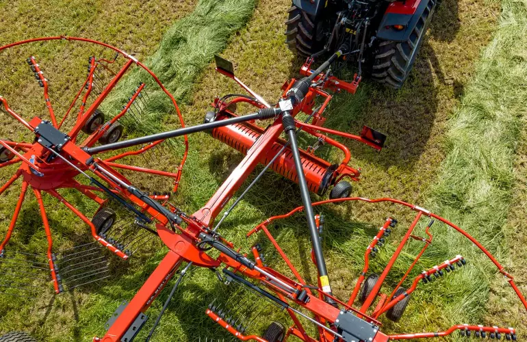 I bracci forche sugli andanatori GA sono in posizione ipertangenziale. Ciò significa che raggiungono un angolo di 90° molto tardi. Con la camma ad angolo acuto delle forche, l'altezza dal suolo delle forche è rapida e richiede un piccolo sforzo di rotazione per realizzare andane regolari, soffici e dritte. L'andanatura è di alta qualità anche ad alte velocità perché il foraggio non viene spinto oltre l'andana.