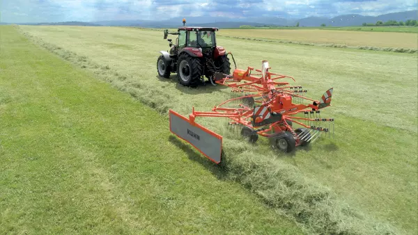 La larghezza di andanatura può essere regolata idraulicamente da 3.00 a 5.80 m. Le densità di foraggio variabili, l'aggiramento di ostacoli e la fine del campo non sono più un problema. Per foraggi molto densi e per la produzione di andane di notte, il GA 6002 può anche eseguire la posa di due andane in ciascun passaggio.