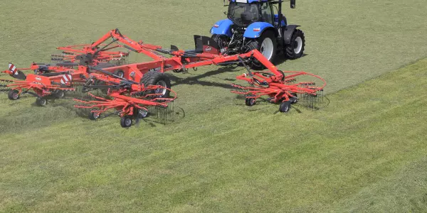 Il nuovo andanatore a quattro rotori GA 13031 posa andane centrali e ha una larghezza di lavoro compresa tra 8.40 m e 12.50 m. Grazie all'azionamento idraulico al 100% vi consente di risparmiare un'ora di manutenzione al giorno.