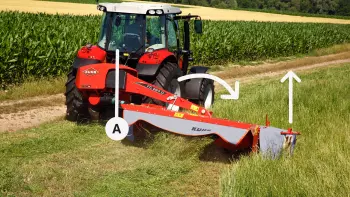 Nessun agricoltore può permettersi una falciatrice danneggiata a metà stagione perché ha urtato un ostacolo o per una manovra sbagliata. Le falciacondizionatrici FC della serie 104 LIFT-CONTROL sono equipaggiate con un sistema attivo che assicura una pressione sul suolo costante, fino a un angolo di 11°. Se la macchina dovesse urtare un ostacolo, la pressione al suolo viene fortemente ridotta e l’unità di taglio ruota fino a 25° all’indietro oltrepassando l’ostacolo. Il sistema di protezione NON-STOP attivo è efficace anche quando la barra di taglio viene urtata sulla sinistra poiché il punto di pivot del braccio è abbastanza lontano dai primi dischi (A). L’unità di taglio ritorna automaticamente nella sua posizione di lavoro iniziale con il sistema NON-STOP. La combinazione del sistema di protezione NON-STOP e delle sospensioni di questa macchina è esclusivo sul mercato.