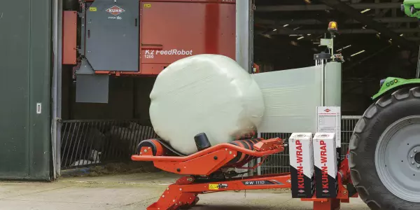 KUHN RW 1110 è un modello con agganci rapidi e attacco a tre punti, ideale per le operazioni "fascia e impila" sul campo o sull'aia. Fasciare nel luogo di stoccaggio significa ridurre il rischio di danneggiare la pellicola. La soluzione ottimale per la fasciatura con un solo operatore.