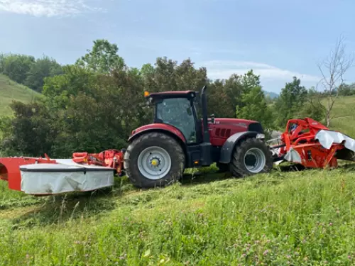 Per fare questo, di recente, Manfredi ha deciso di rinnovare il proprio parco macchine, acquistando un cantiere completo KUHN di nuovissima generazione per la fienagione: le falciacondizionatrici frontale FC 3125 DF-FF e posteriore FC 3115 DF-FF, la falciatrice posteriore GMD 240 FF, il giro-spandivoltafieno GF 8712 T con larghezza di lavoro di 8,70 metri, e il giro-andanatore GA 7530 da 7,50 metri.
